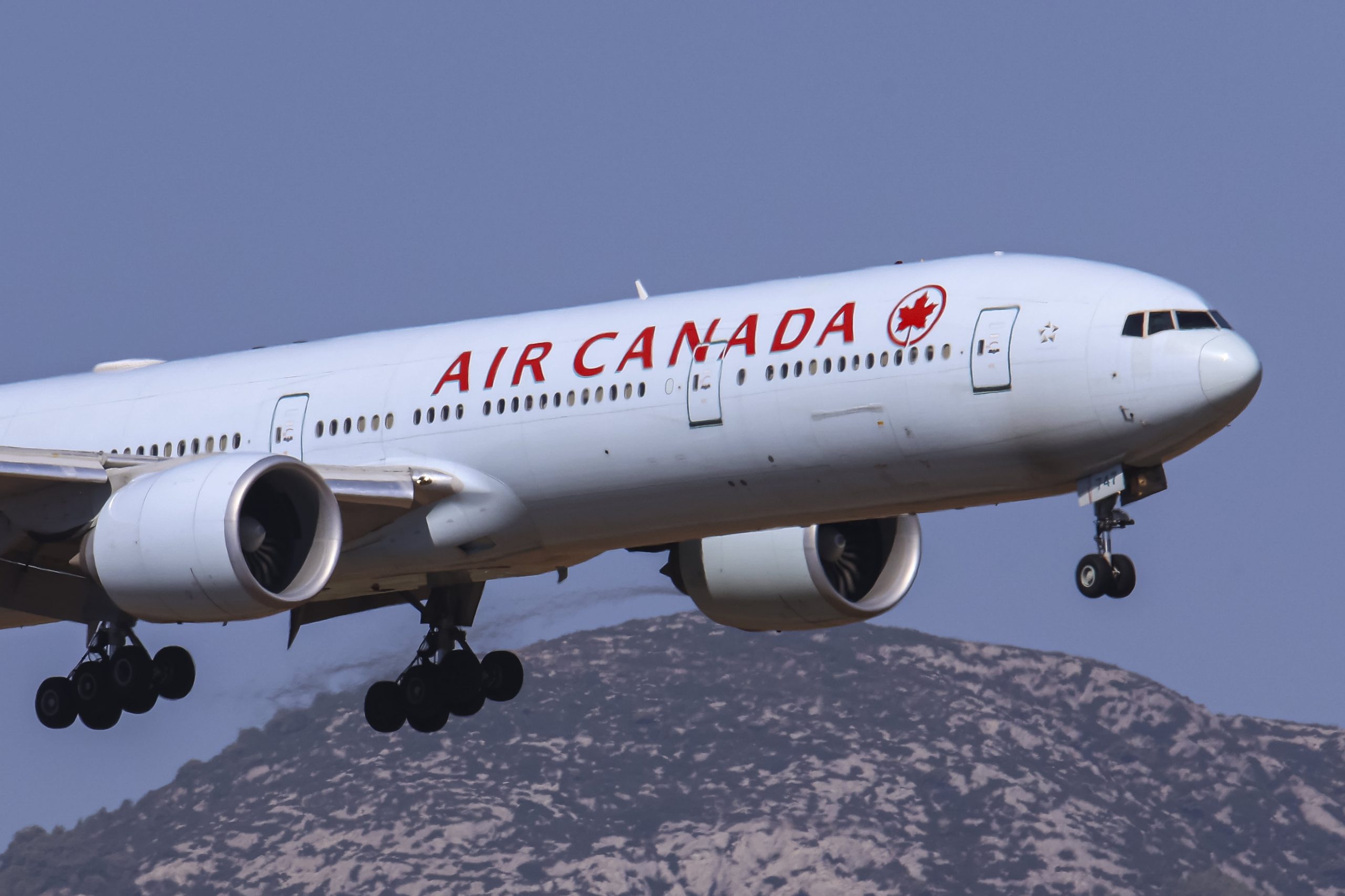 Air Canada Boeing 777-300ER passenger aircraft spotted flying on final approach for landing on the runway of Athens International Airport Eleftherios Venizelos at the Greek capital.