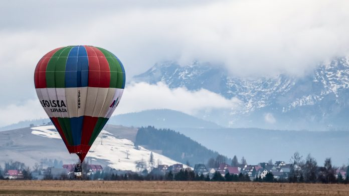 A pilot flies hot air balloon during the Lesser Poland Baloon Festival, a part of Polish Cup, at Nowy Targ Airport, against Tatra mountains in Nowy Targ, Poland, on March 29, 2025.