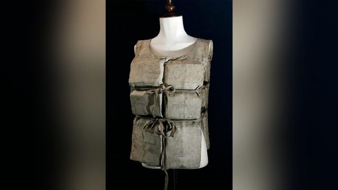 The cream-colored life jacket, made of canvas with cork-filled sections, has been displayed at museums in the United States and Europe.