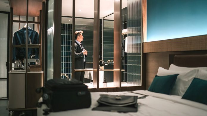 Modern hotel room with glass-partitioned bathroom and a guest adjusting a suit jacket at the sink.