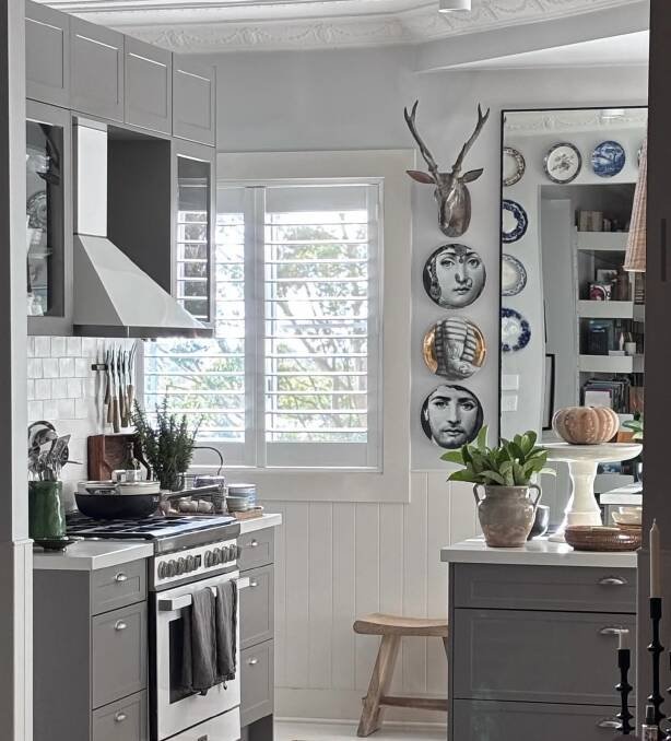 The country cottage has a manicured garden, while a large verandah wraps the single-storey home with a classic green, white and grey palette.